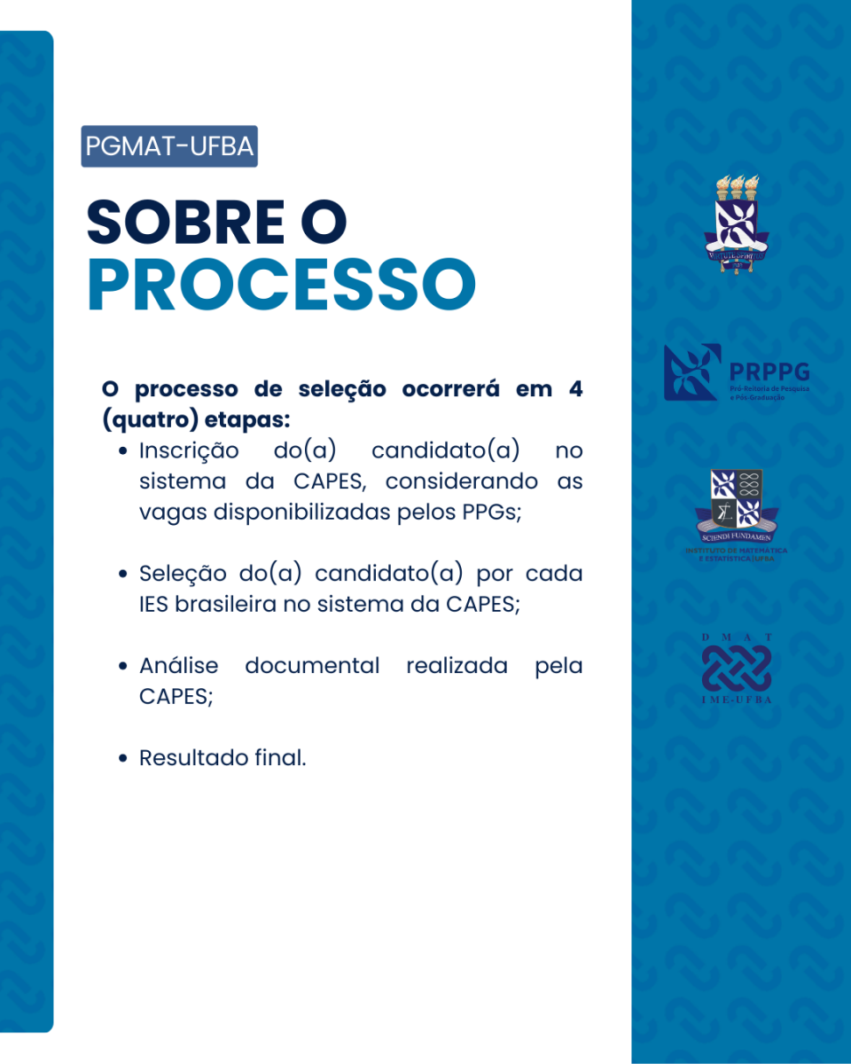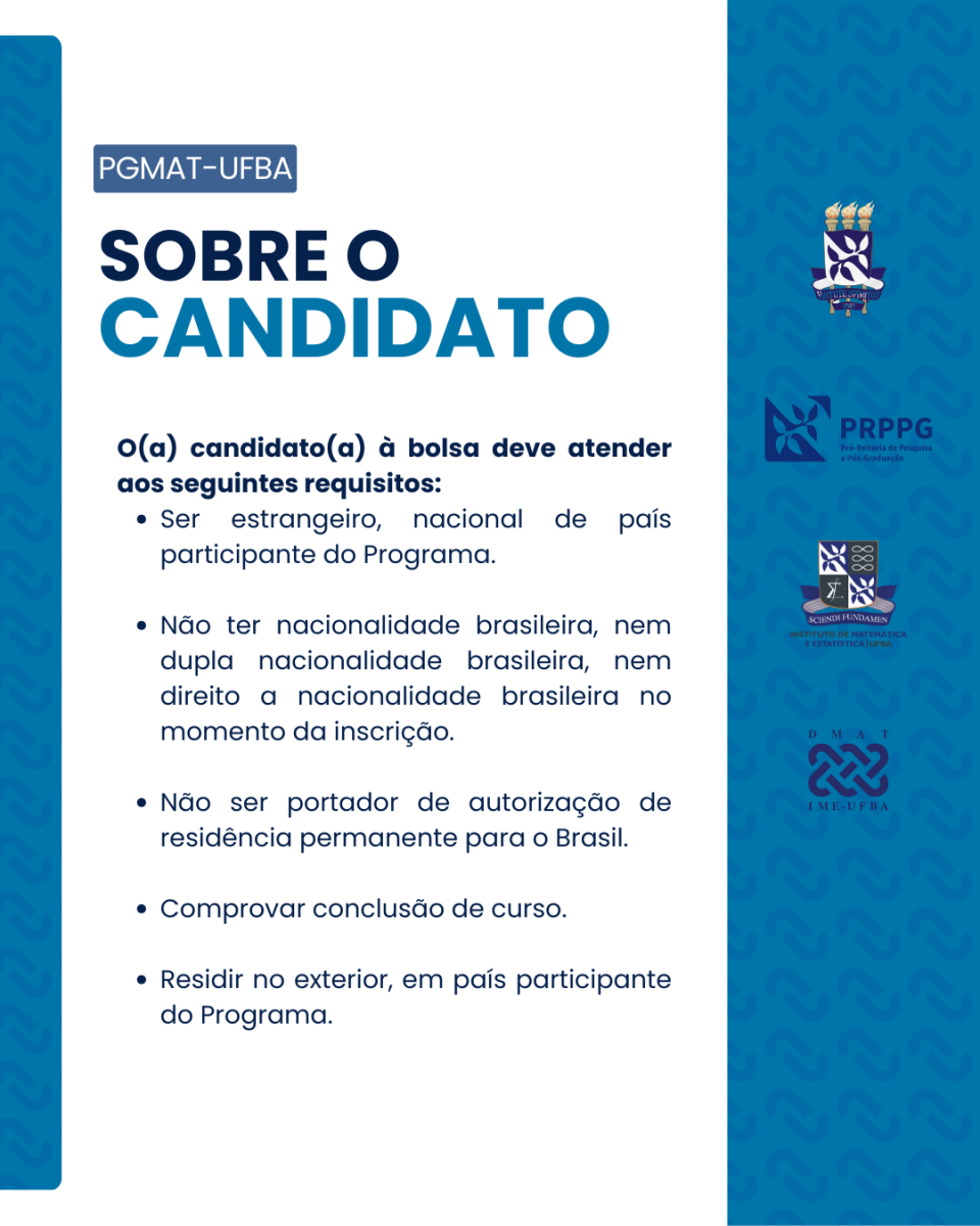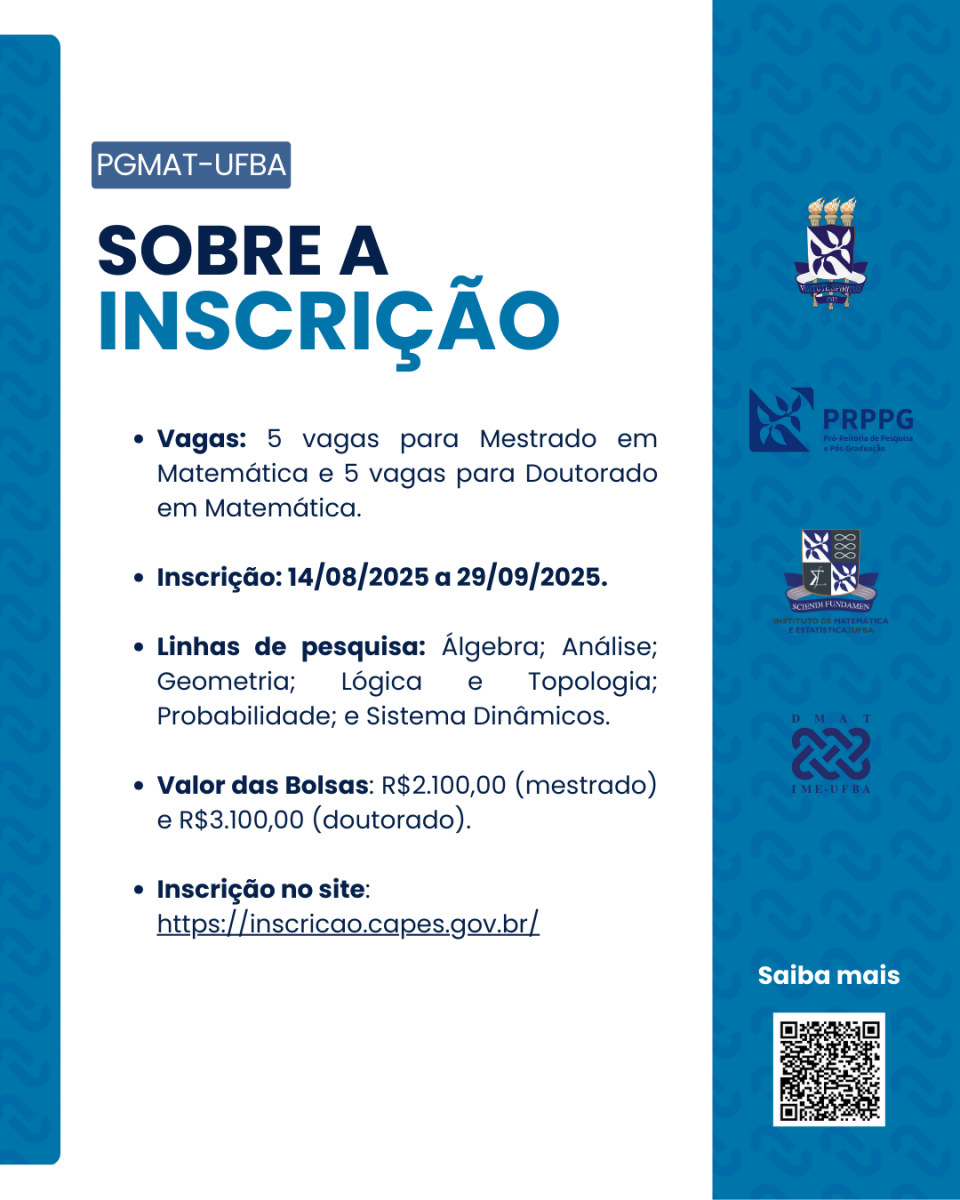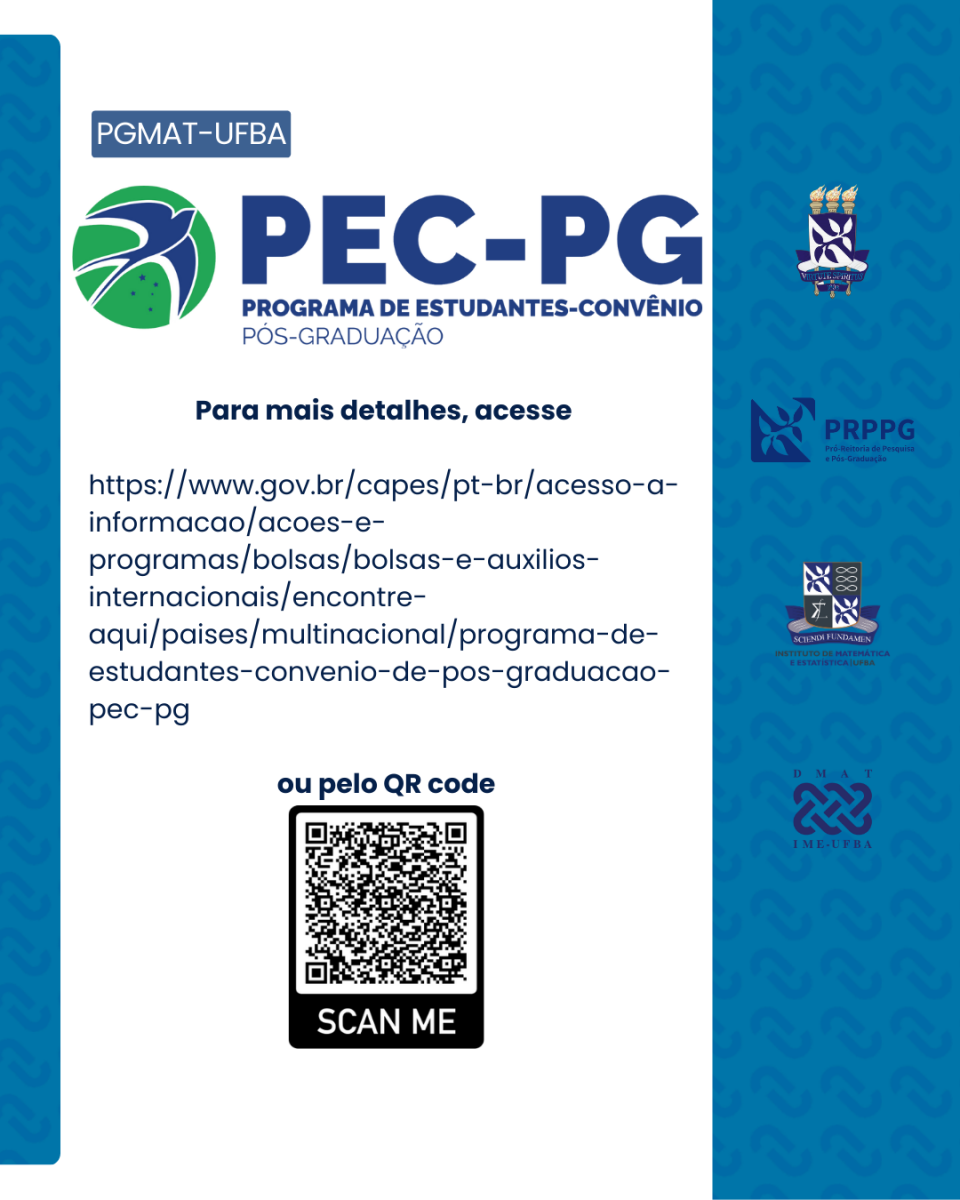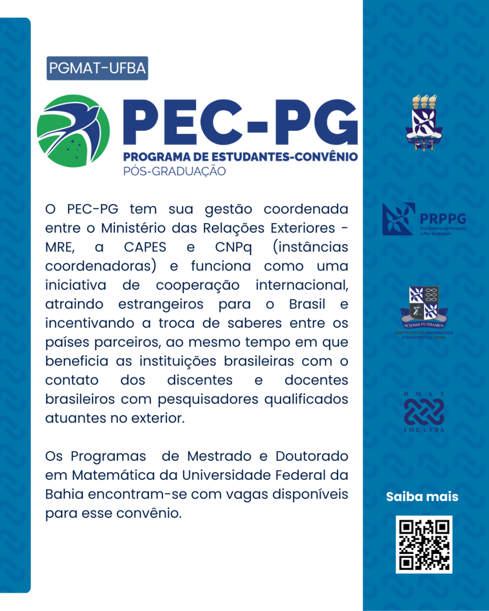 Os Programas de Mestrado e Doutorado em Matemática da Universidade Federal da Bahia encontram-se com vagas disponíveis para esse convênio.