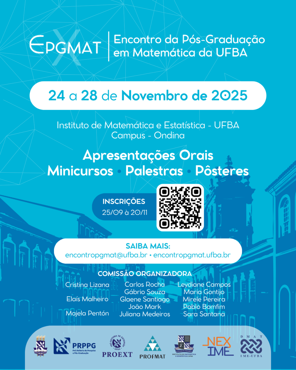 Para mais informações sobre o evento, acesse o site X Encontro da Pós-Graduação em Matemática da UFBA - EPGMAT | Pós-Graduação em Matemática ou siga nossas redes sociais @epgmatufba