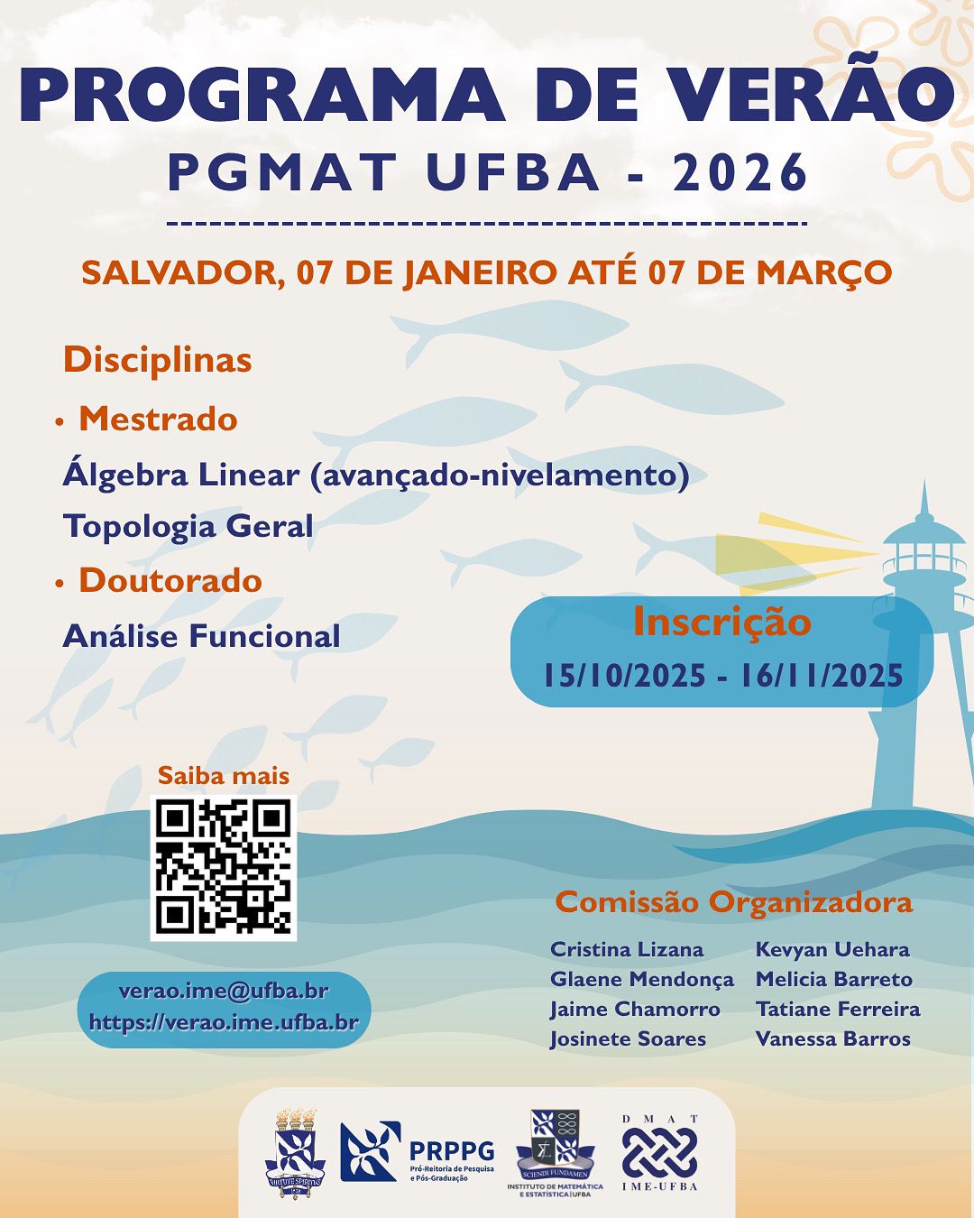 É com grande satisfação que anunciamos mais uma edição do Programa de Verão PGMAT-UFBA (2026), que acontecerá de 07 de janeiro a 07 de março de 2026, em formato 100% presencial no Instituto de Matemática e Estatística, Campus Ondina da Universidade Federal da Bahia.