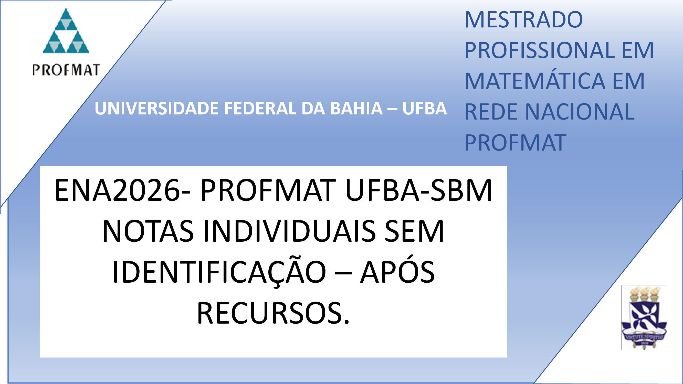 A coordenação do Profmat - UFBA 2026 disponibiliza aos(às) candidatos(as) a lista com a pontuação individual de todos(as) os inscritos, após o envio dos recursos no link: https://pgmat.ufba.br/pt-br/resultados-editais